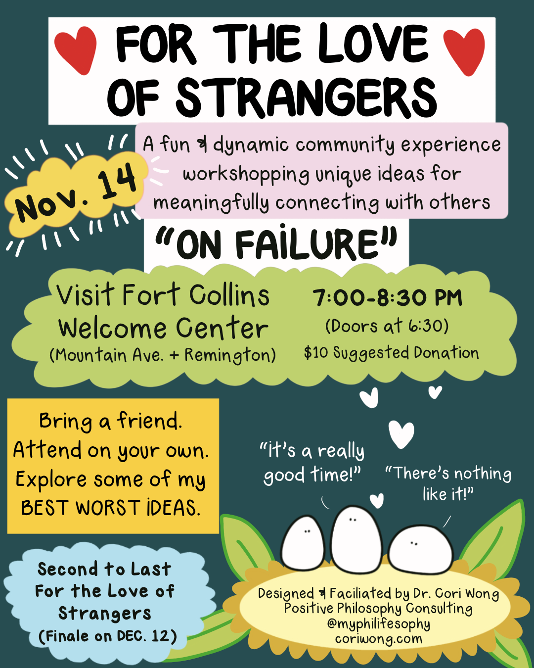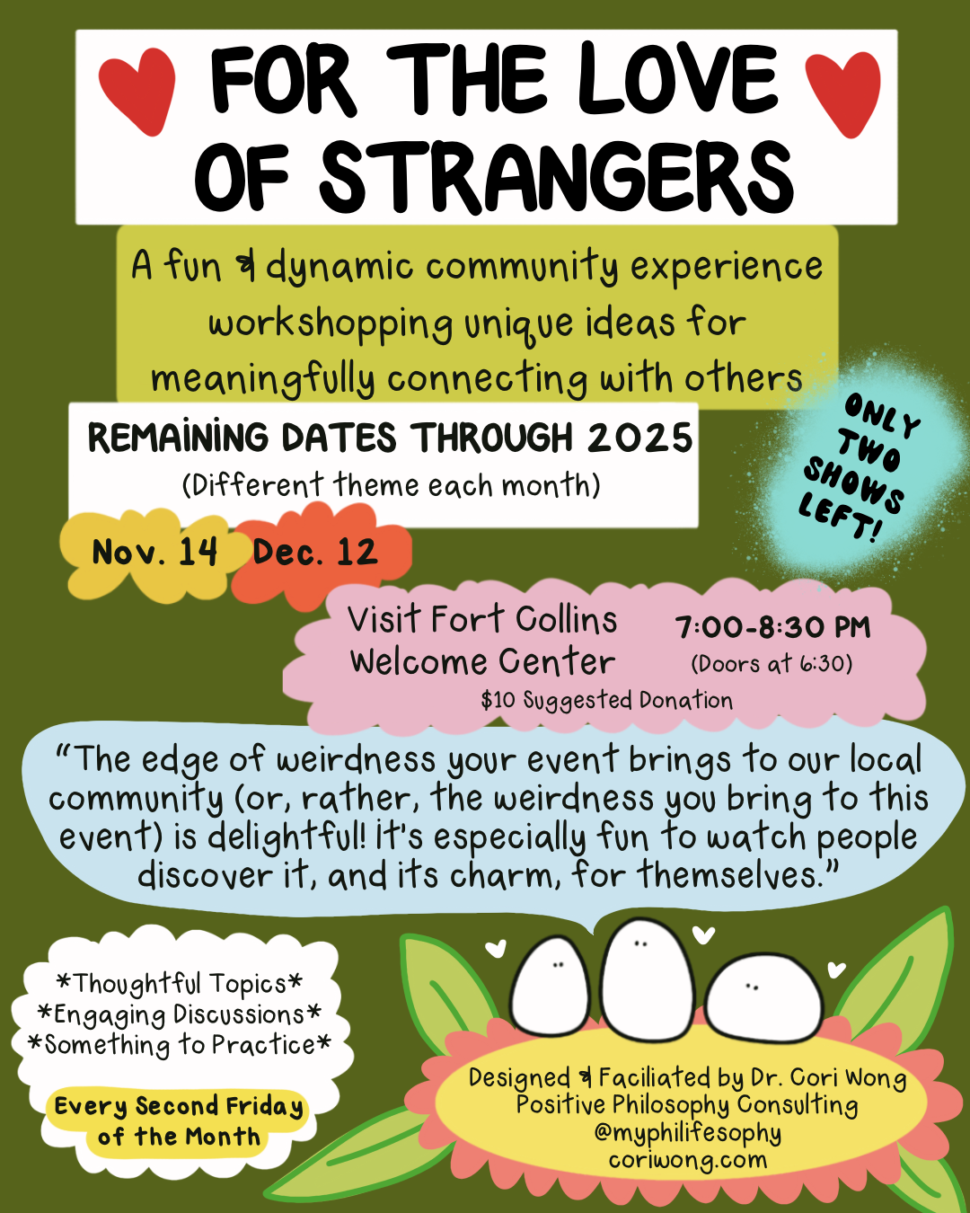 For the Love of Strangers runs every Second Friday of the Month from 7:00-8:30 pm at the Visit Fort Collins Welcome Center (February - December, 2025).